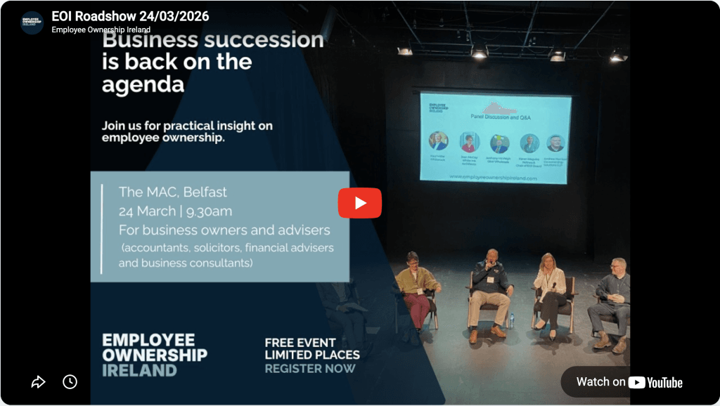 Watch the recording of our latest Employee Ownership Ireland roadshow, streamed live on 24 October 2026. Catch up on the full session and hear practical insights on employee ownership, succession planning and adviser engagement.